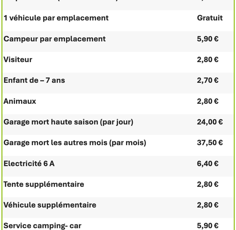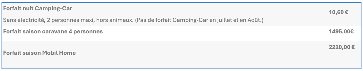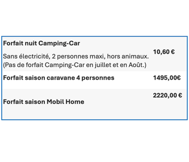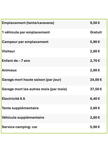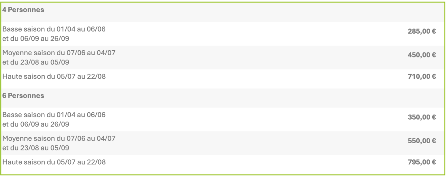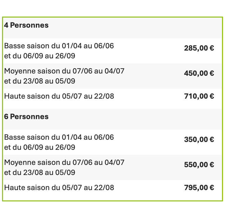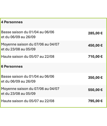 Tarifs hebdomadaires. Du samedi 15H au samedi suivant 10H. Animaux interdits.